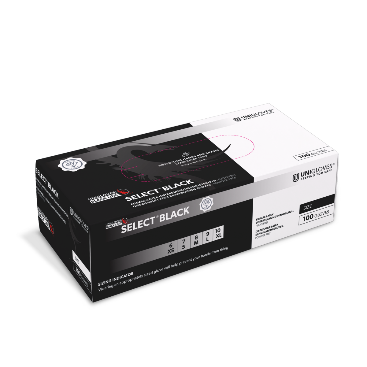 Le Select Black est un gant d'hygiène et de protection alimentaire en latex naturel de haute qualité. Ce gant souple et jetable est principalement utilisé dans les secteurs de la restauration et du nettoyage, ainsi que dans les studios de tatouage. La plus grande longueur du poignet est indispensable pour l'industrie du tatouage et du piercing. Le Select Black a été testé conformément au règlement EPI (UE) 2016/425 et aux normes européennes EN 374, EN 420 et EN 455. Le matériau imperméable du gant est particulièrement résistant à l'abrasion et offre une protection contre les virus, les champignons et les bactéries. Le Select Black séduit également par son extensibilité particulière et son grand confort de port. Avec une teneur en protéines inférieure à 50 µg/dm², le Select Black est également extrêmement doux pour la peau. Les surfaces des doigts et de la paume en microsillons garantissent une résistance au glissement et une manipulation sûre de diverses surfaces et instruments. Le Select Black est chloré et possède un bord roulant ferme, ce qui permet de l'enfiler et de l'enlever facilement. L'utilisation alternée est facilitée par l'ajustement flexible et la conception ambidextre. Le gant est disponible en noir et dans les tailles S, M, L et XL.